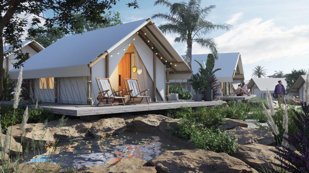 פתרונות הלינה יהיו מגוונים על טהרת האירוח המדברי החל ממתחם קמפינג עצמאי, אוהלים רגילים ומשפחתיים, אוהלים ממוזגים עם מקלחות ושירותים משותפים, ועד לאוהלים יוקרתיים עם בריכות פרטיות ובהם סוויטה נשיאותית יוקרתית. המתחם יהיה בנוי בבנייה מדורגת – המבנים הציבוריים והמרחבים המוצלים בפרגולות נמוכים בני קומה אחת ומאפשרים מבט פתוח לים.